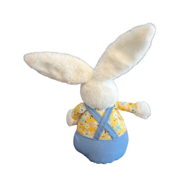 Discrição: Coelinho decorativo de macacão azul e camisa amarelo florido